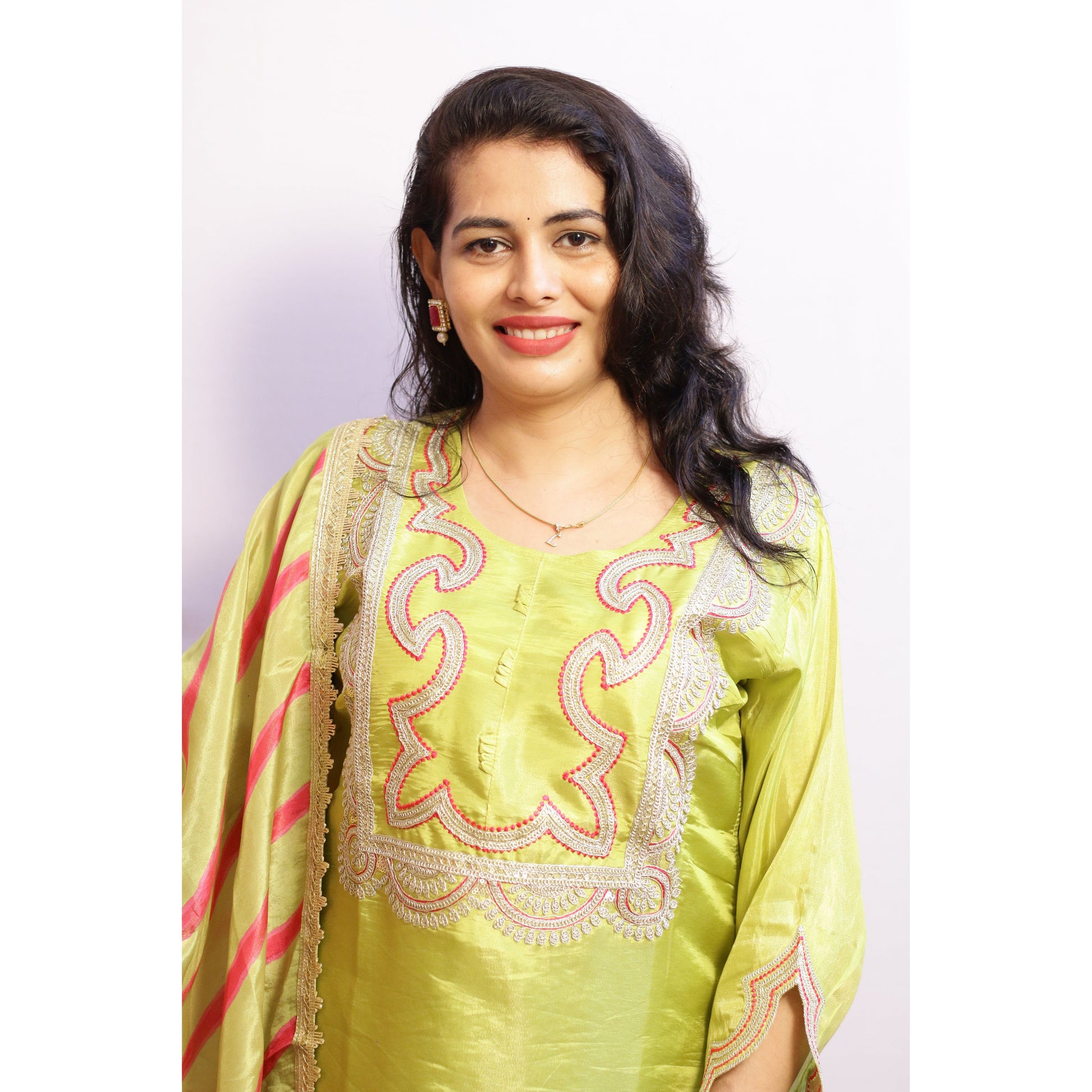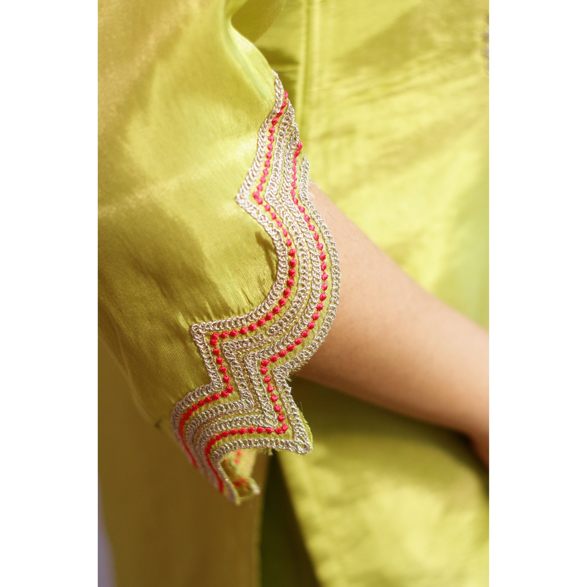 Expertly crafted from high-quality dola silk fabric, the Dhita Green Suit Set exudes elegance and sophistication. Its green embroidered yoke and designer embroidered sleeves add a touch of luxury, while the shibori effect on the pink and green duppatta adds a unique twist. Complete with a pure solid dola silk pant, this set is perfect for any formal occasion.