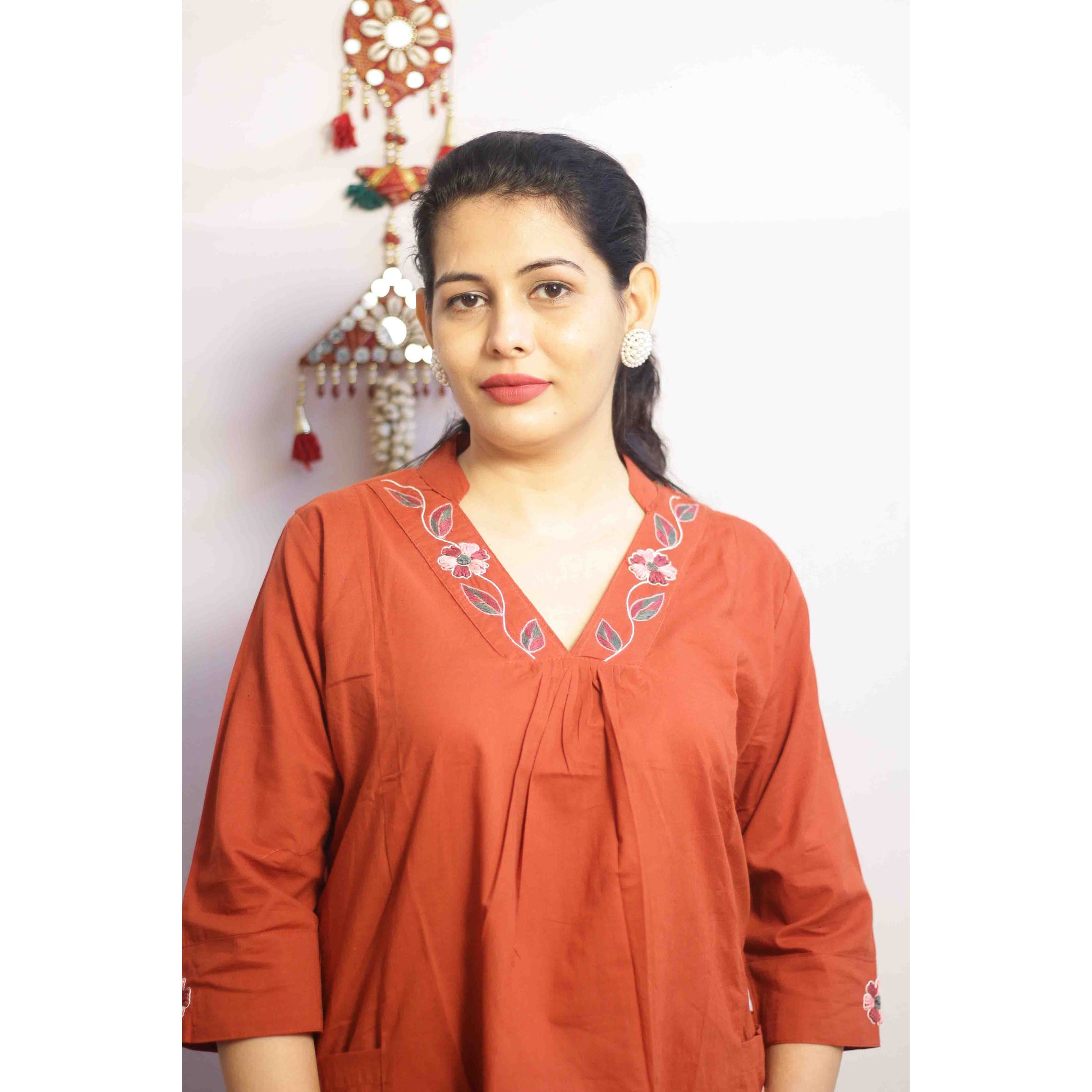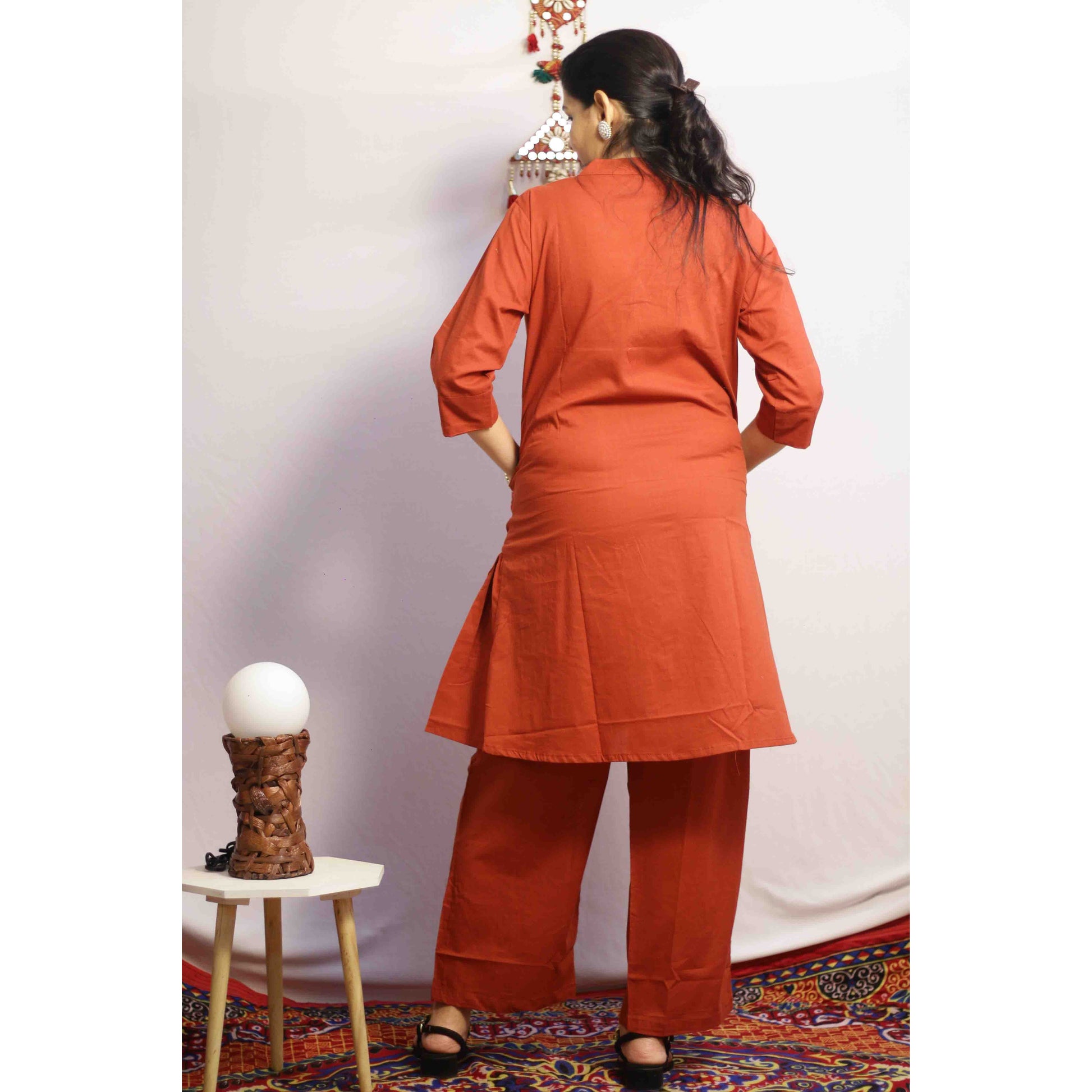 Make comfort meet elegance with this rust-toned pure cotton cord set, designed for effortless everyday style. The kurti features a flattering V-neckline with delicate floral embroidery on the neck, sleeves, and 2 pocket panels, along with subtle pleats and gathered detailing near the hemline – adding just the right amount of flair. Paired with matching straight-fit pants, this set is breathable, soft on the skin, and ideal for long office hours, casual outings, or travel.