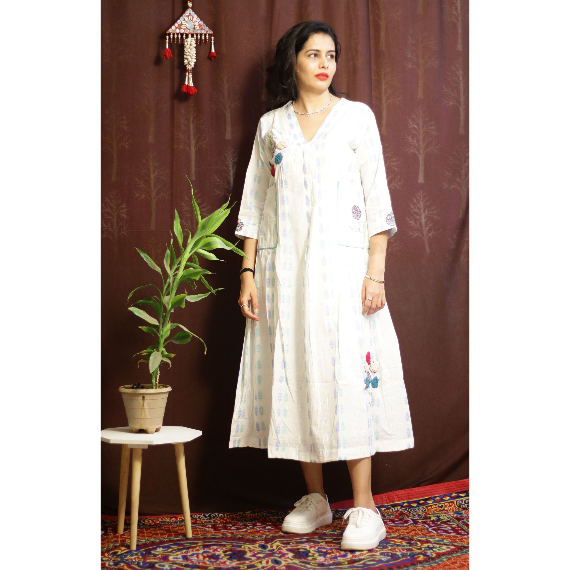 The Farah White Dress is expertly crafted from pure cotton and features intricate weaving and bullion knot work embroidery. The A-line pattern flatters all body types, while the V neck design adds a touch of elegance. Complete with 2 front pockets and delicate embroidery on the back, this dress is both stylish and functional.