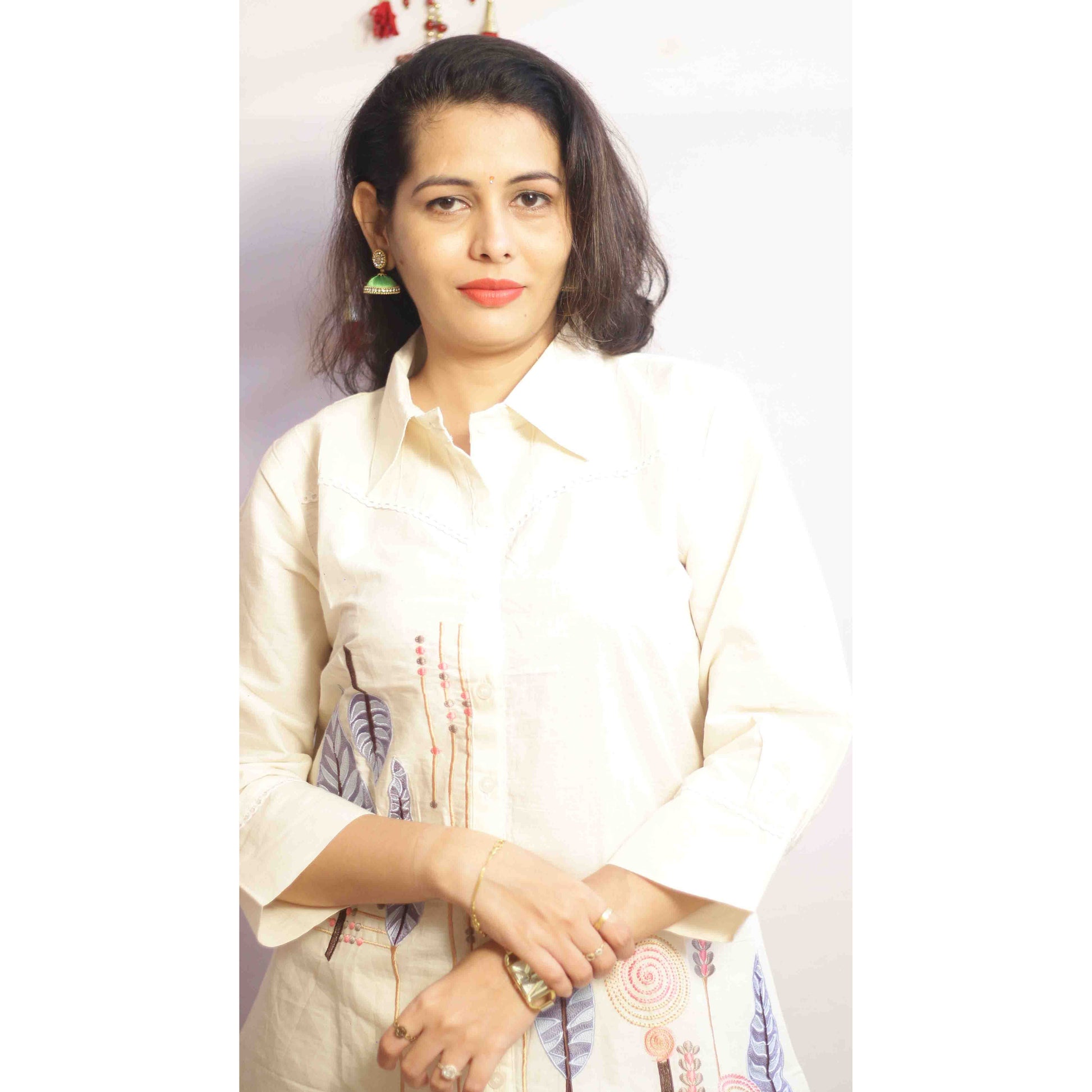 This Gungun Beige Co-ord Set features a pure cotton fabric that ensures comfort and breathability. The shirt-style top is designed with full sleeves and detailed with an elegant embroidered leaf motif, adding a refined touch. Coordinated trousers complement the look with subtle embroidered vertical stripes along the sides, creating a cohesive and sophisticated ensemble ideal for both casual and semi-formal occasions.