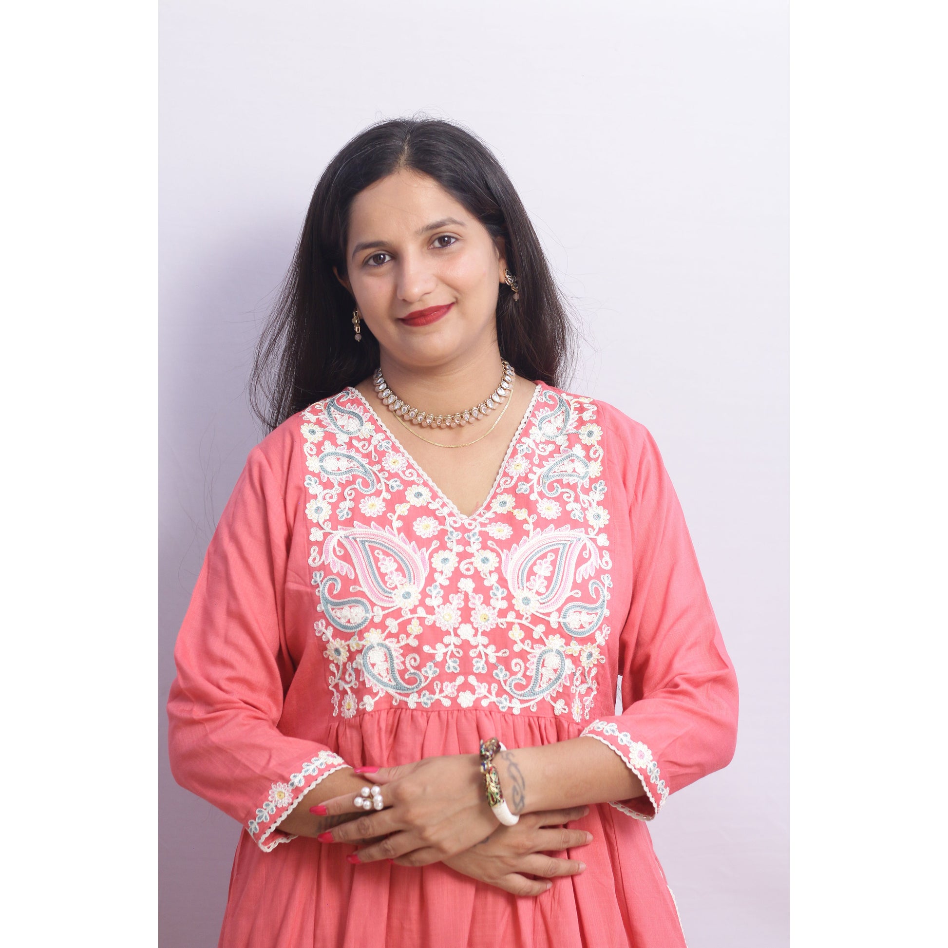 - This Blush Pink Embroidered Kurti Suit Set has a V neckline and three-fourth sleeves. The attractive Kashmiri embroidery is highlighted with multi color thread. It is paired up with pink solid bottom and lace detailing at the bottom and Chiffon dupatta with all over embroidery work which compliments the attire.