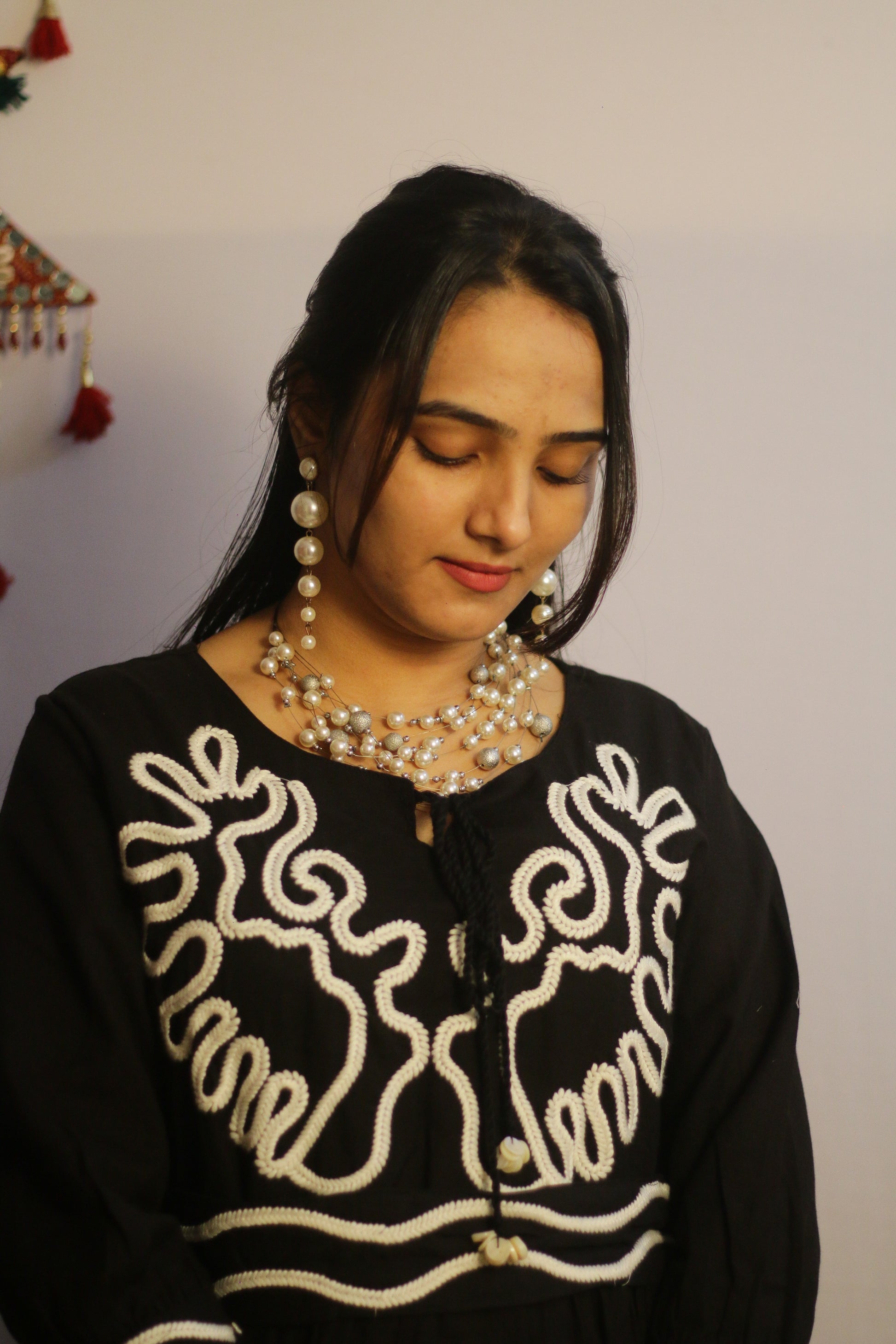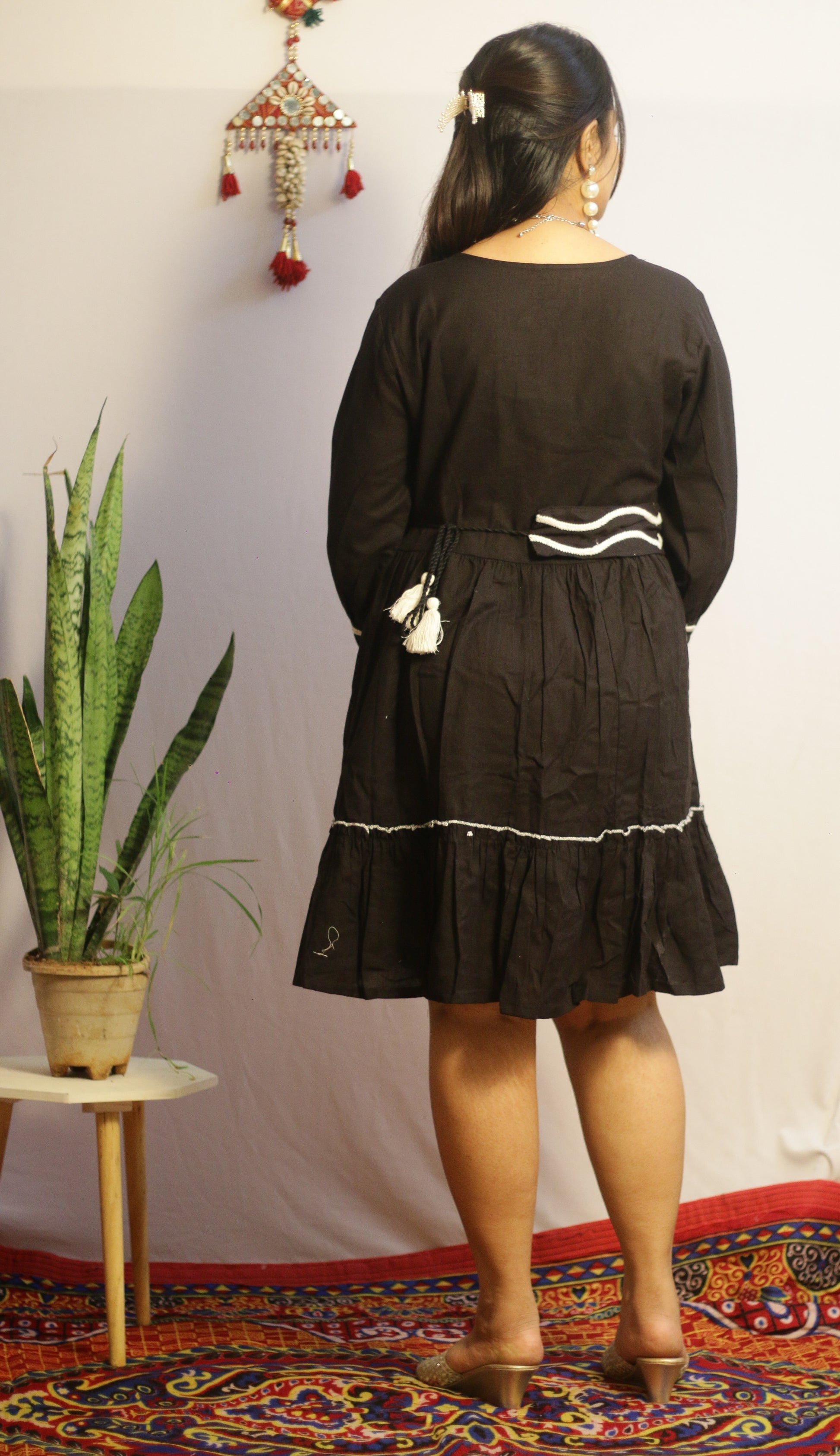 The Luna Black Dress blends sophistication with subtle drama, making it a perfect piece for both casual and festive evenings. Crafted in soft cotton, this dress features exquisite ivory thread embroidery across the neckline, waist, and hem — creating a striking contrast against the deep black fabric. The tiered flare adds movement and grace, while the adjustable waist tie ensures a comfortable, flattering fit. Finished with detailed sleeve embroidery and a touch of bohemian charm, this dress effortlessly transitions from day elegance to evening allure.