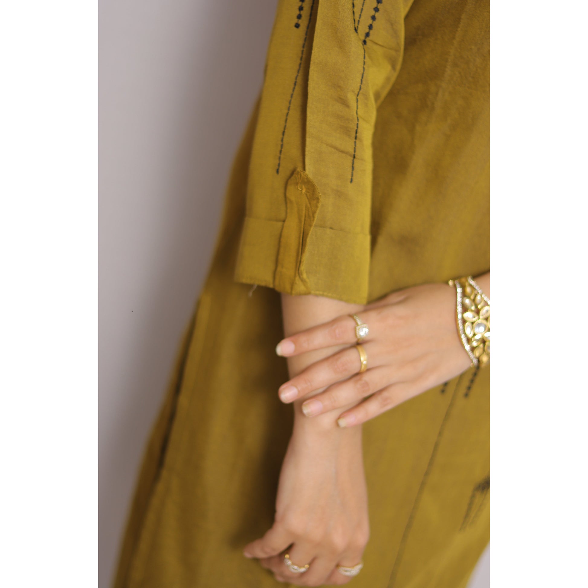 - This Golden Brown embroidered kurti pant set features a round neckline with buttons at yoke, regular length kurti with matching pants in Roman Silk Fabric and three-forth sleeves with side slits.