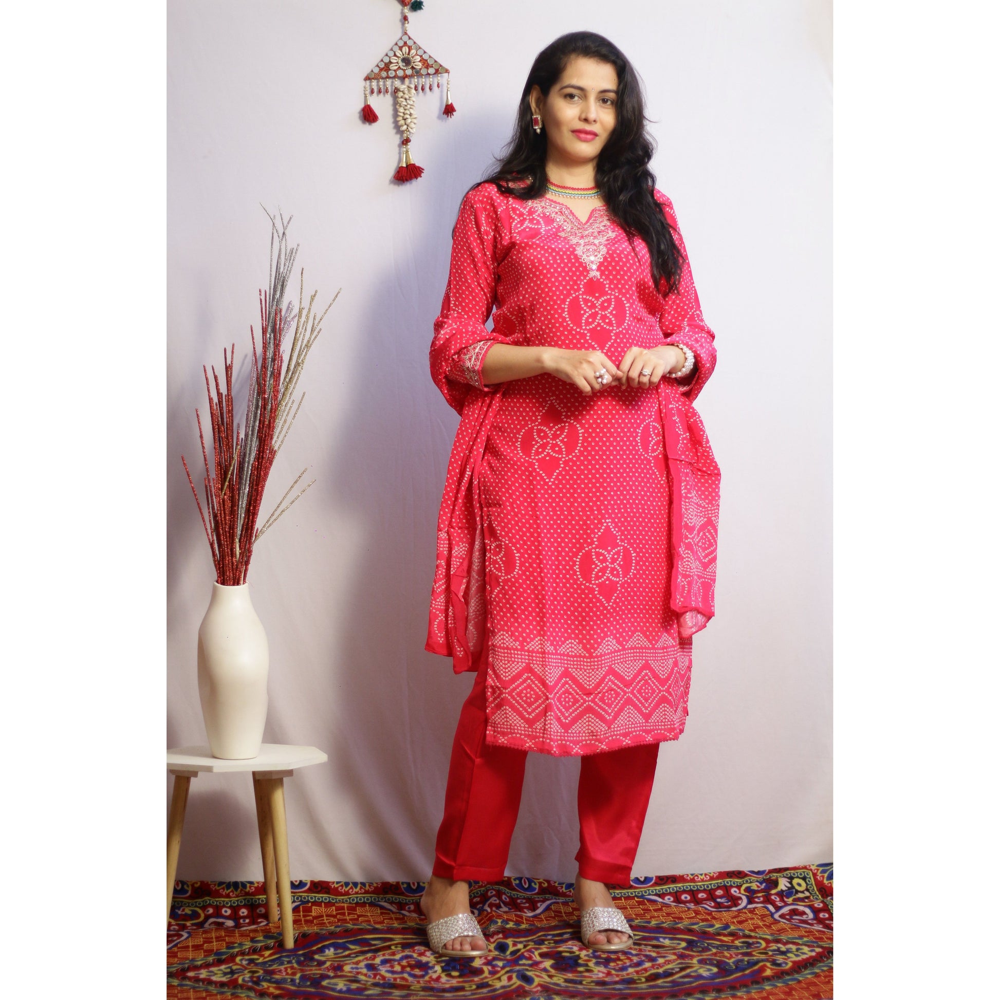 Upgrade your wardrobe with our Pink Bandhani Suit Set. Made from pure natural crepe fabric, this set features a stunning pink and white bandhani print. The embroidery on the neckline and sleeves, along with beautiful lace detailing, adds a touch of elegance. Complete the look with the pure crepe bandhani dupatta.