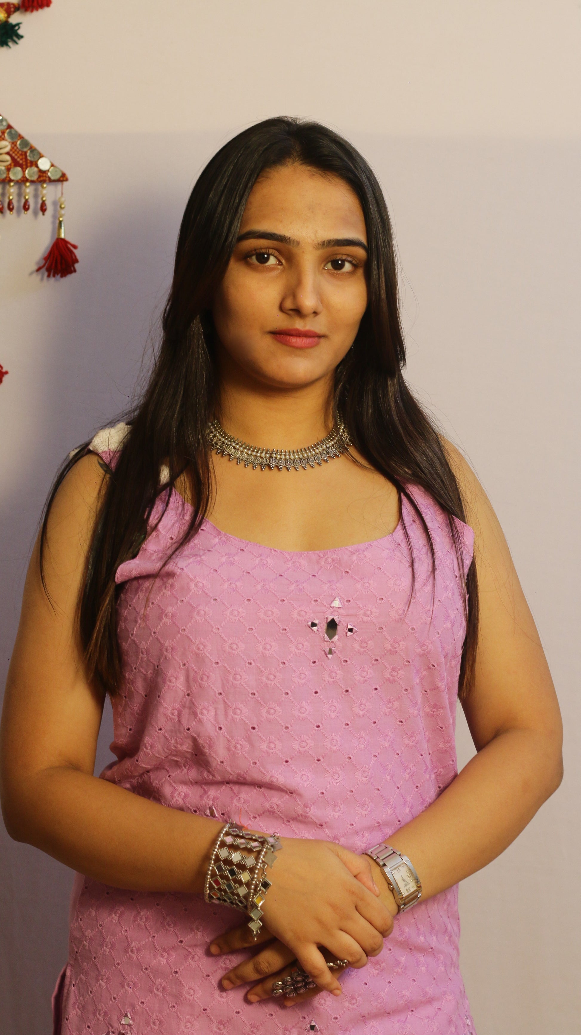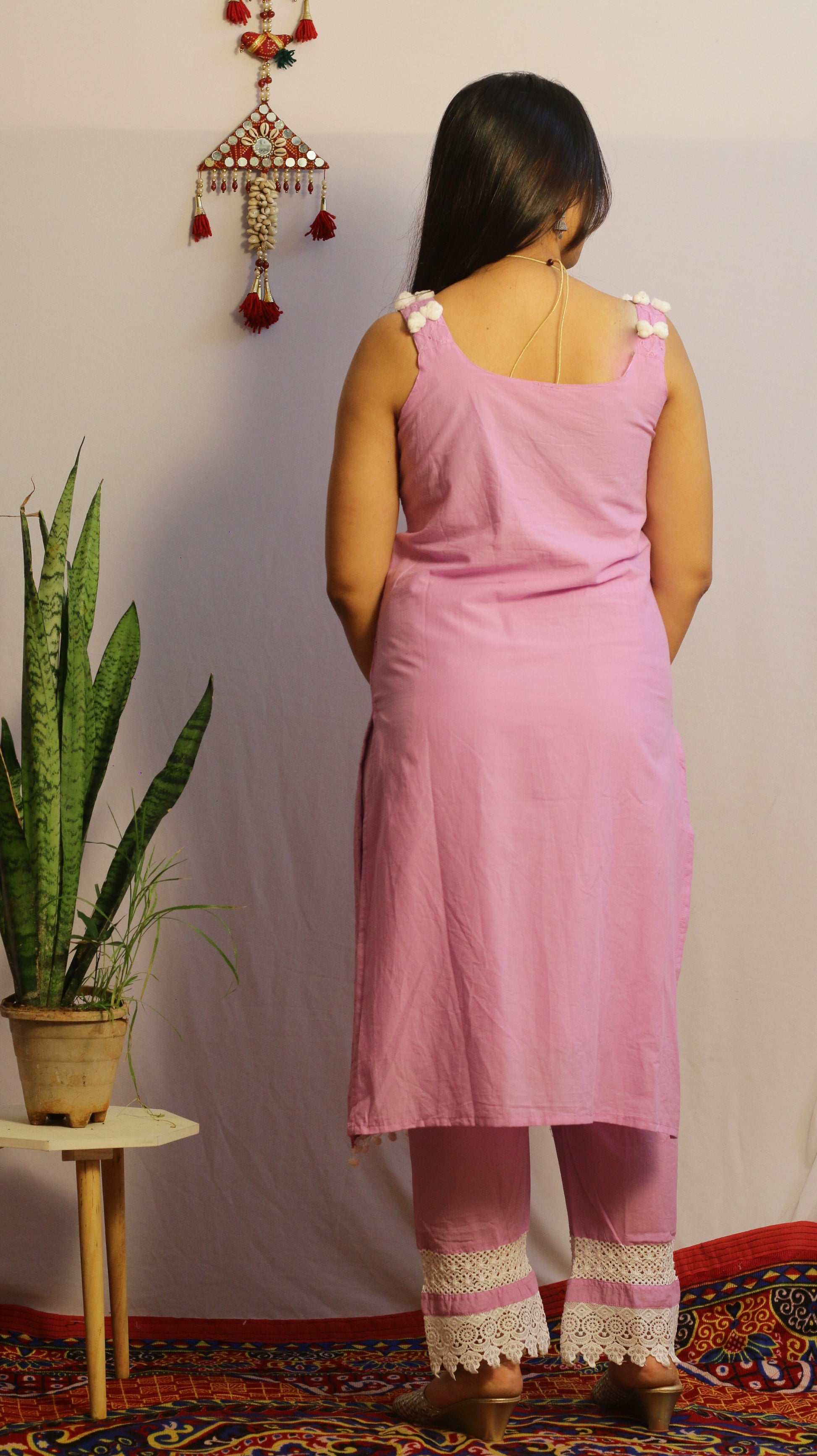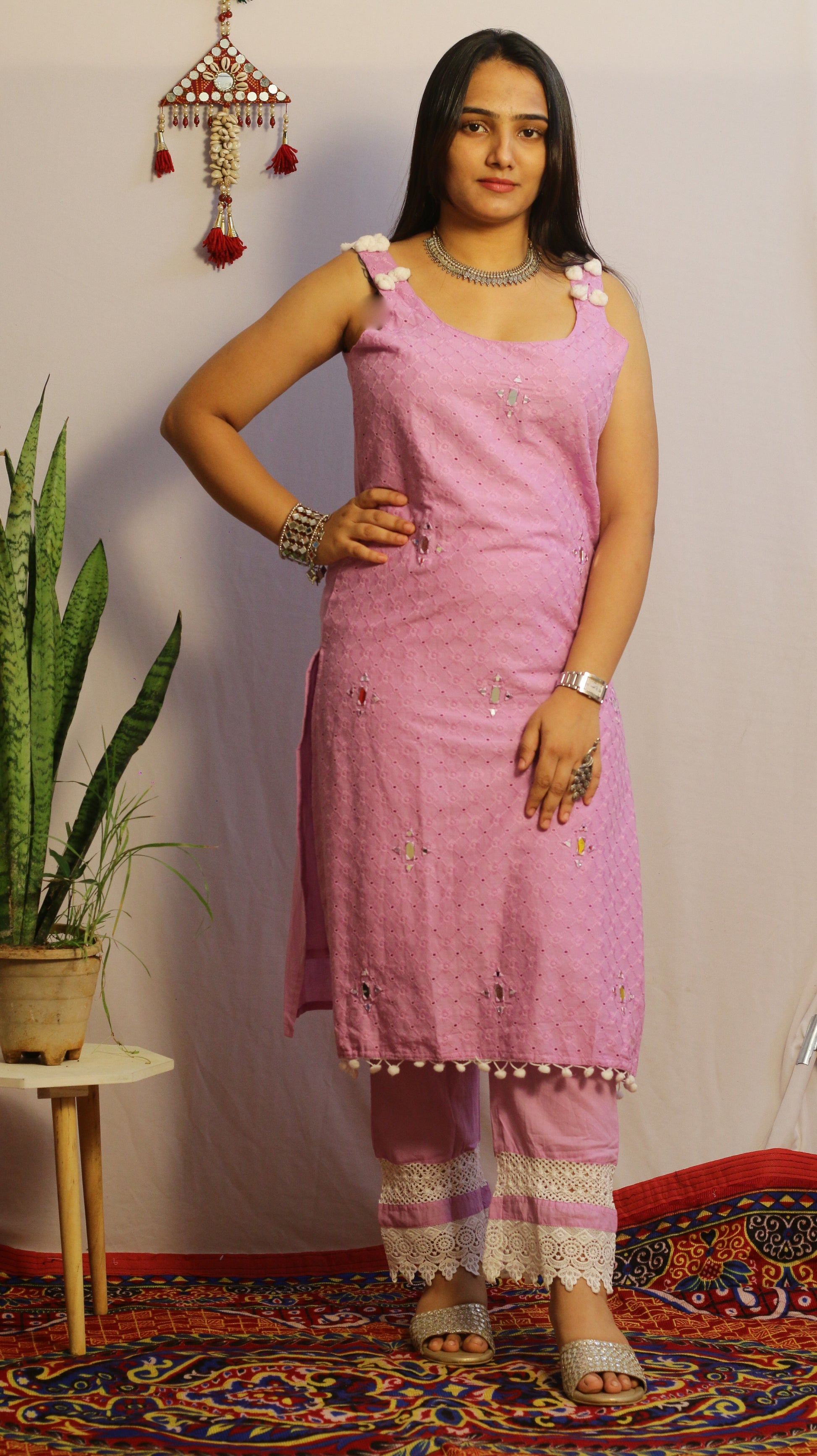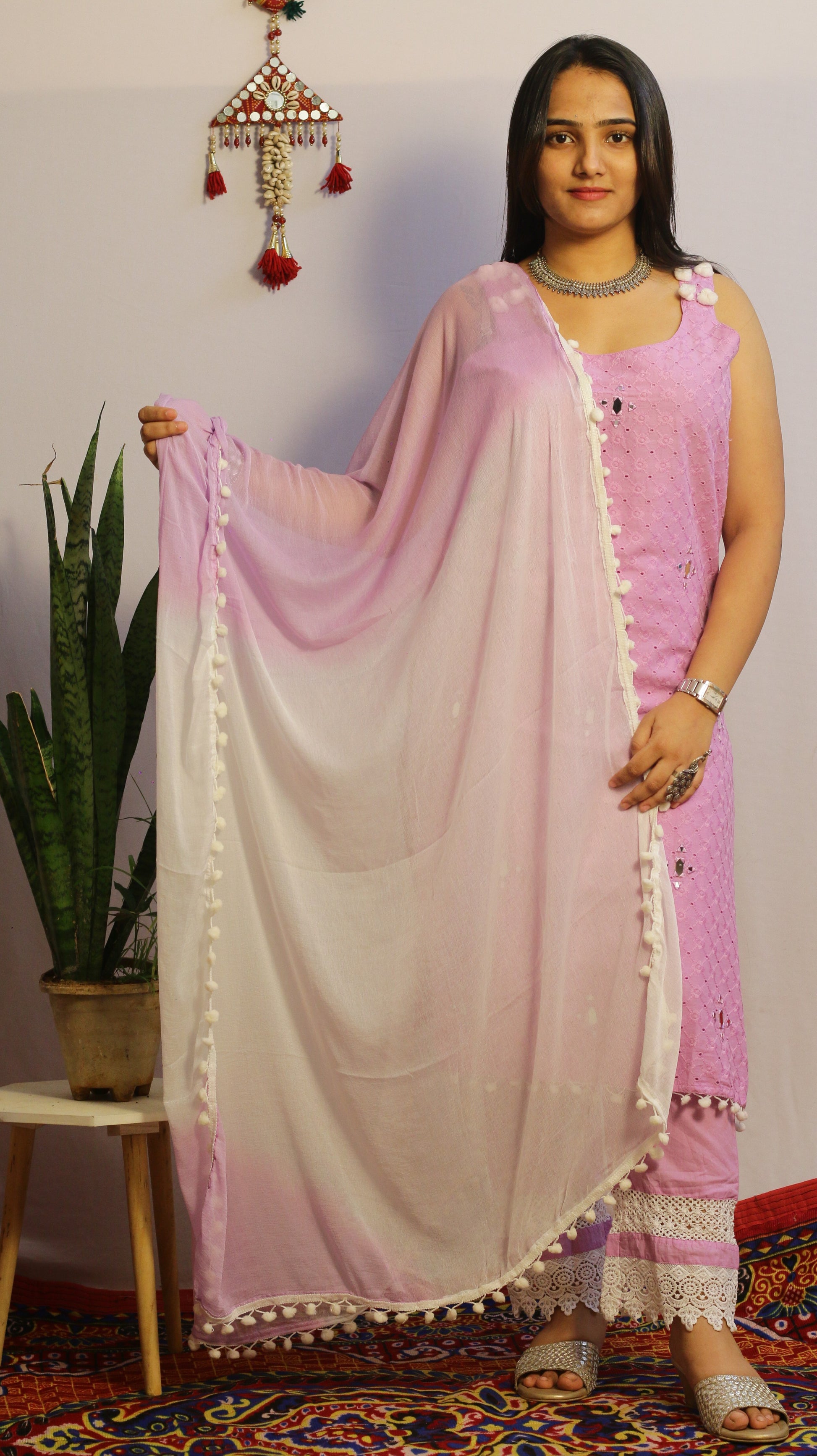 This Pom Pom Lilac Suit Set features pure cotton fabric adorned with delicate schiffli and mirror work embroidery, adding subtle elegance. The sleeveless top boasts a round neckline and charming pom pom detailing, paired perfectly with solid lilac pants enhanced by intricate lace accents. A two-tone chiffon dupatta completes the ensemble, offering a graceful drape. Ideal for those seeking refined craftsmanship with comfortable, breathable wear in a harmonious lilac palette.