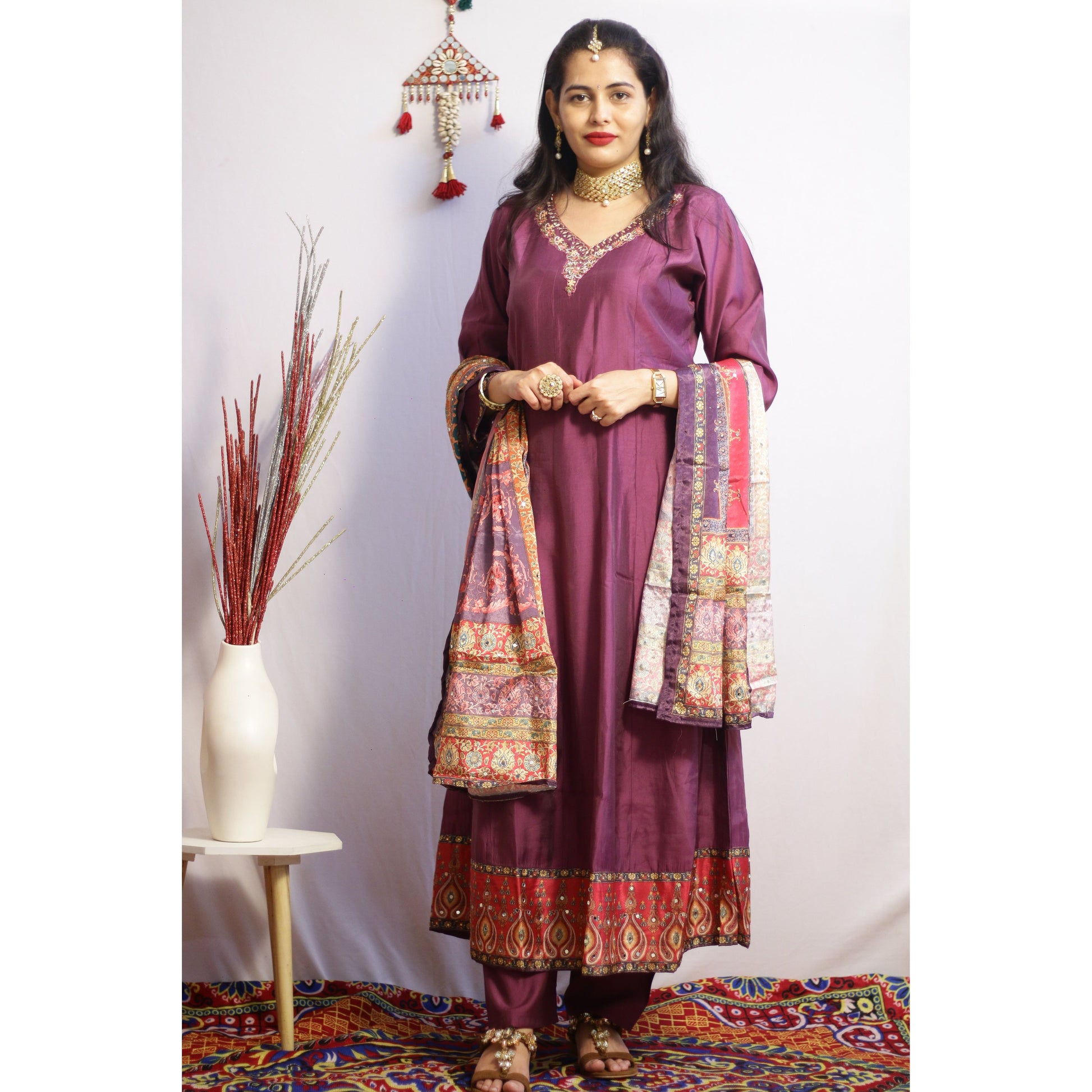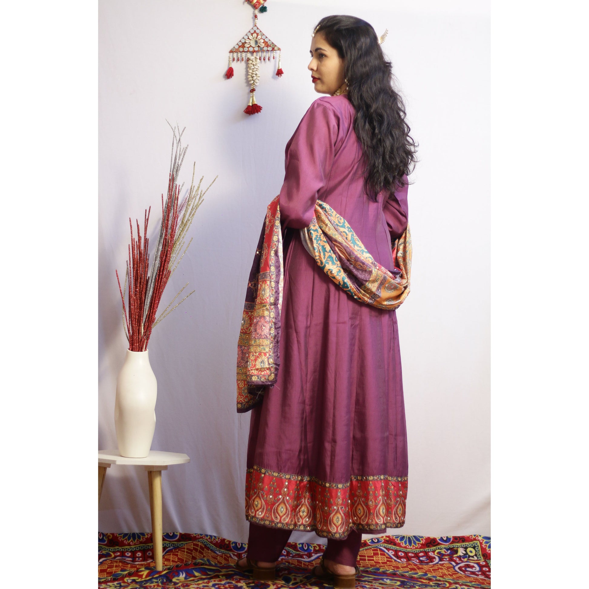 Elevate your ethnic wardrobe with our Purple Anarkali Suit Set. Crafted from luxurious viscose roman silk fabric, it features exquisite mirror work on the neckline, sleeves, and hem of the kurti. The all-over print and mirror work on the duppatta add a touch of elegance. Own the spotlight in this stunning piece.