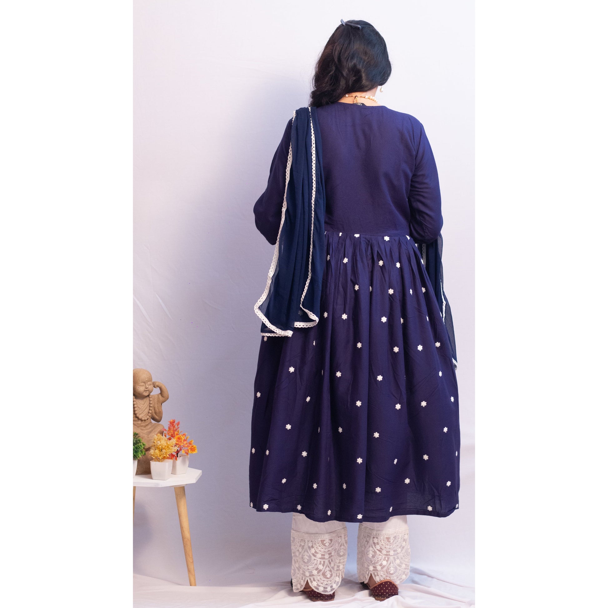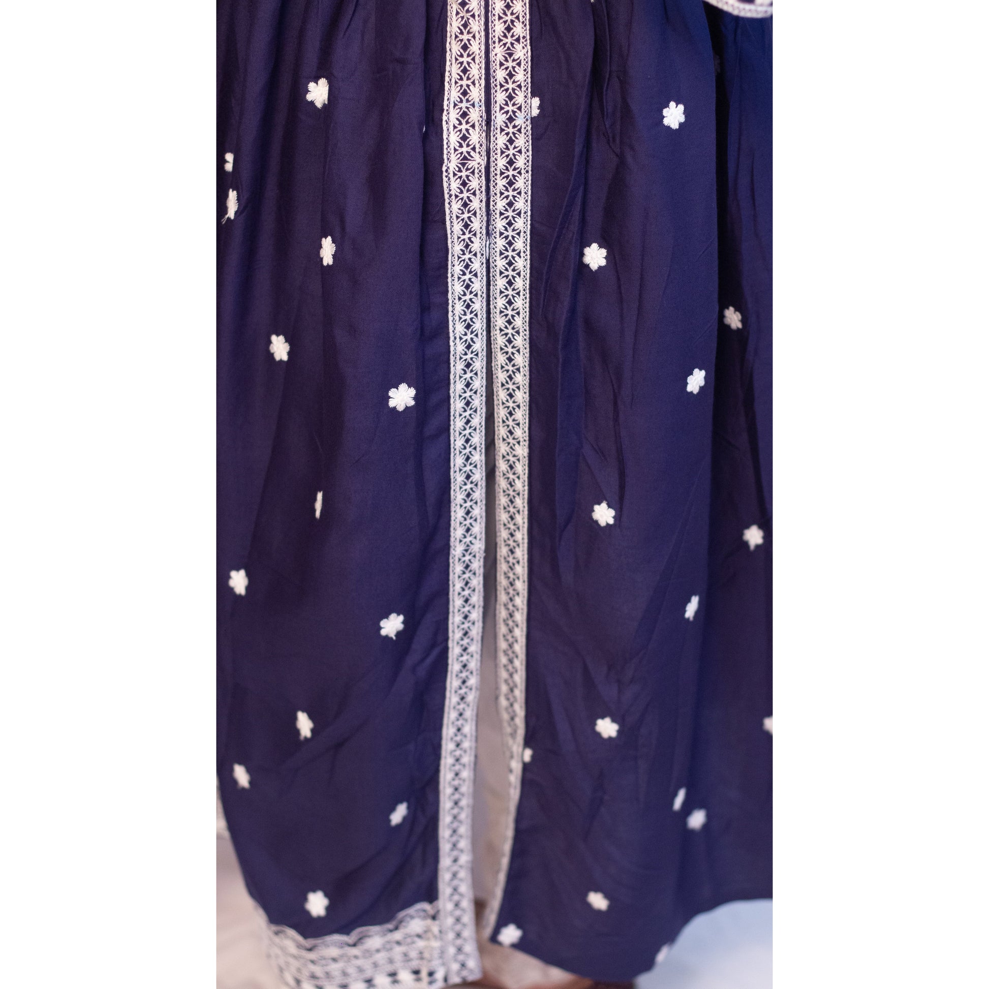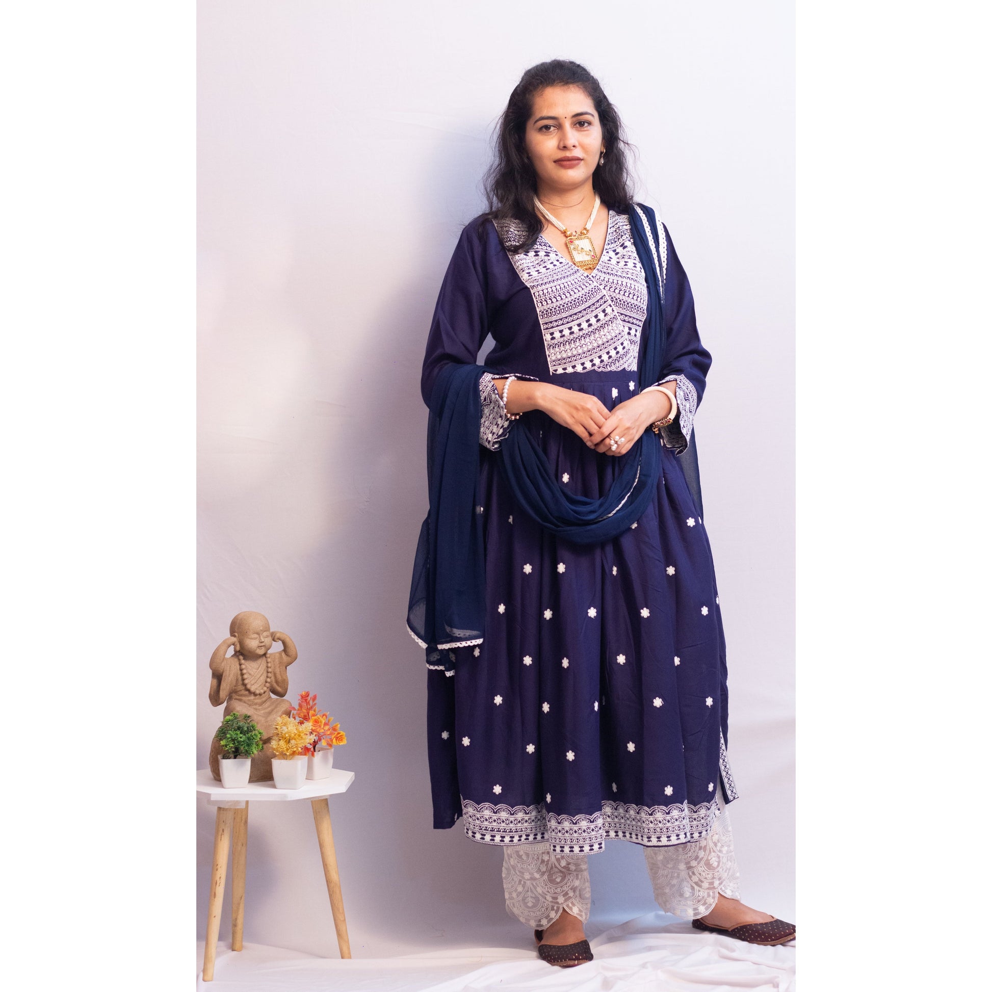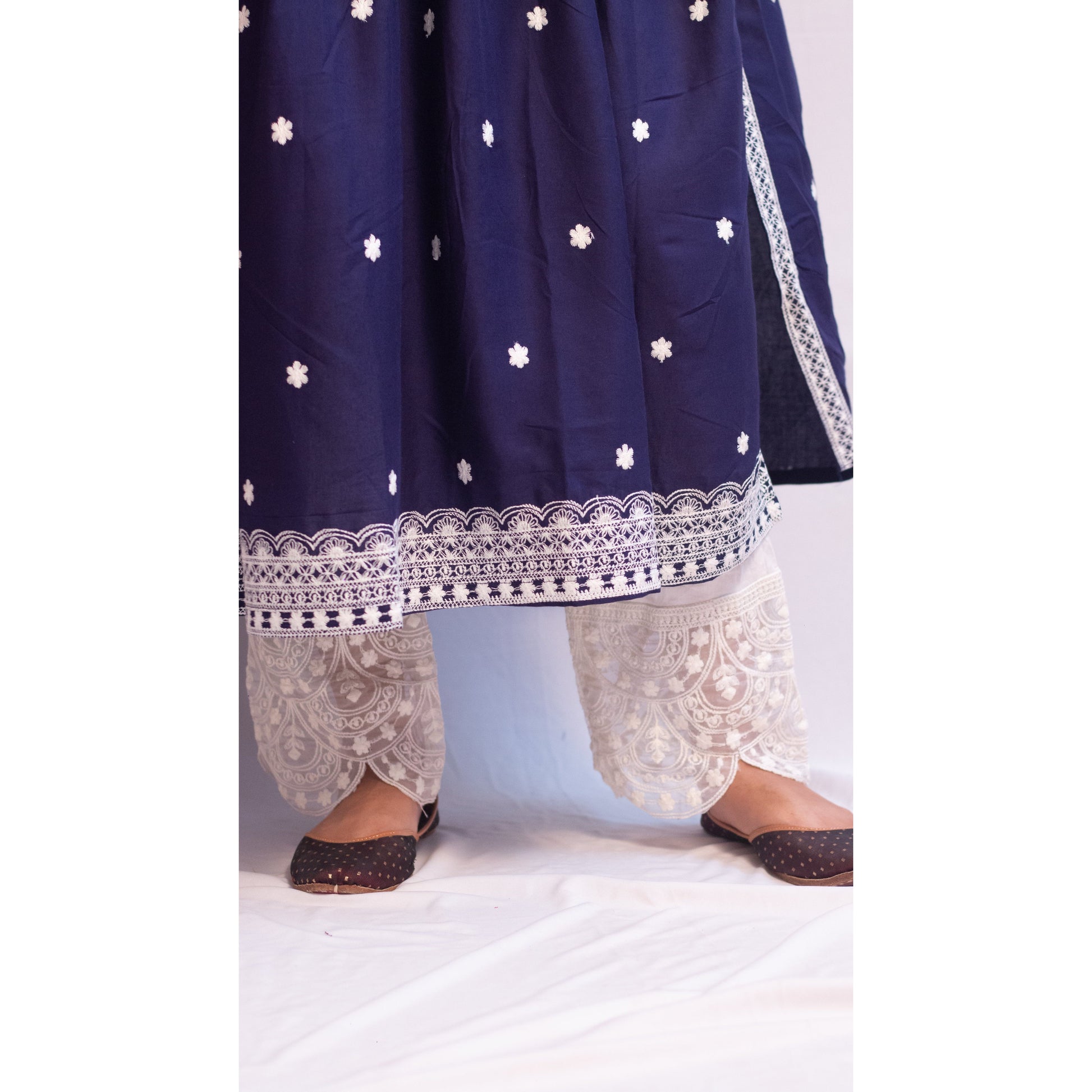 - This Navy Blue Lukhnowi suit set has a V neckline and three-fourth sleeves. The attractive embroidery is highlighted with white thread. It is paired up with Cotton Lycra White solid bottom and lace detailing at the bottom and chiffon dupatta with GPO lace which compliments the attire.