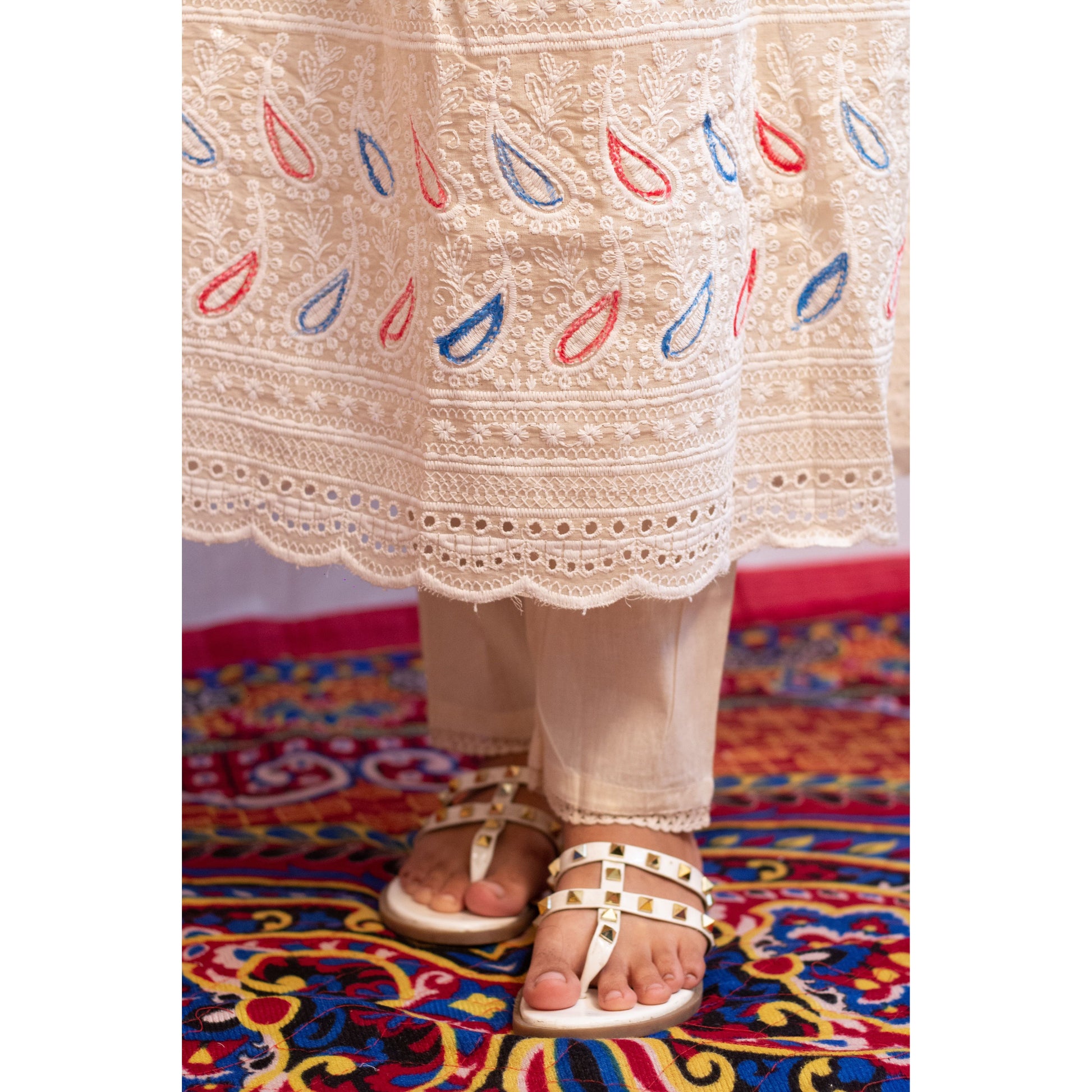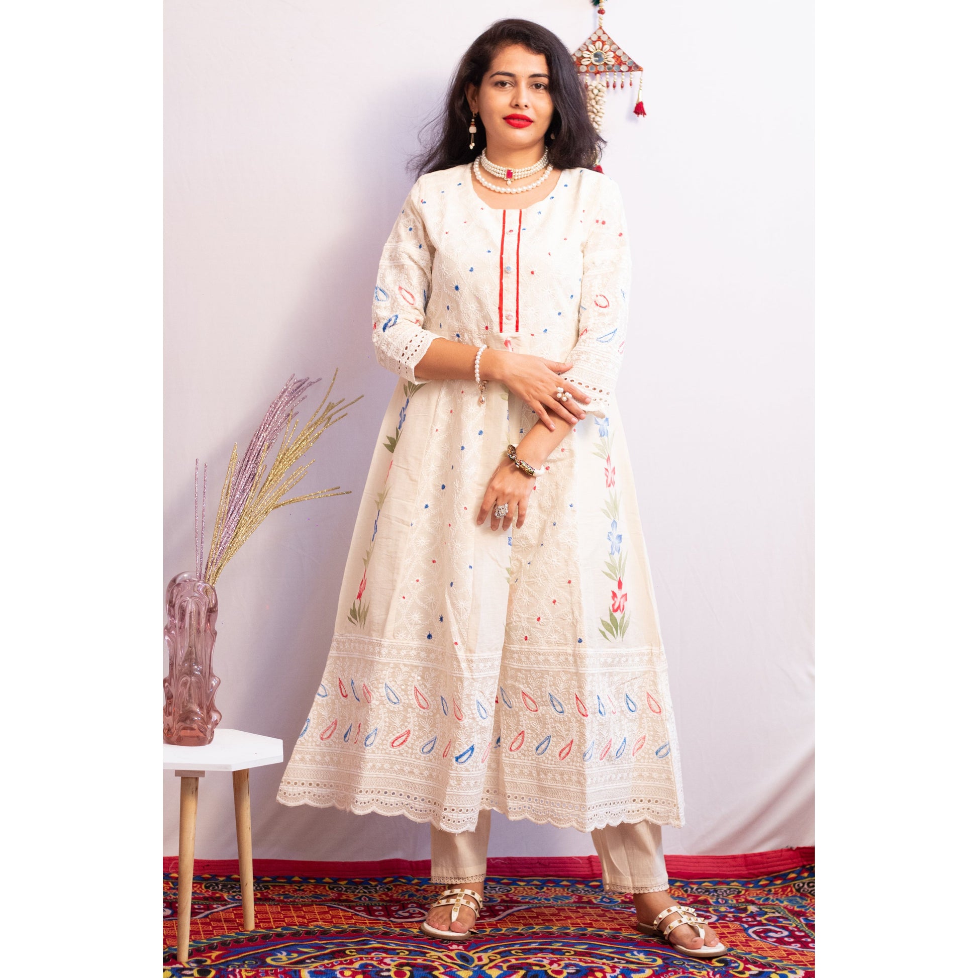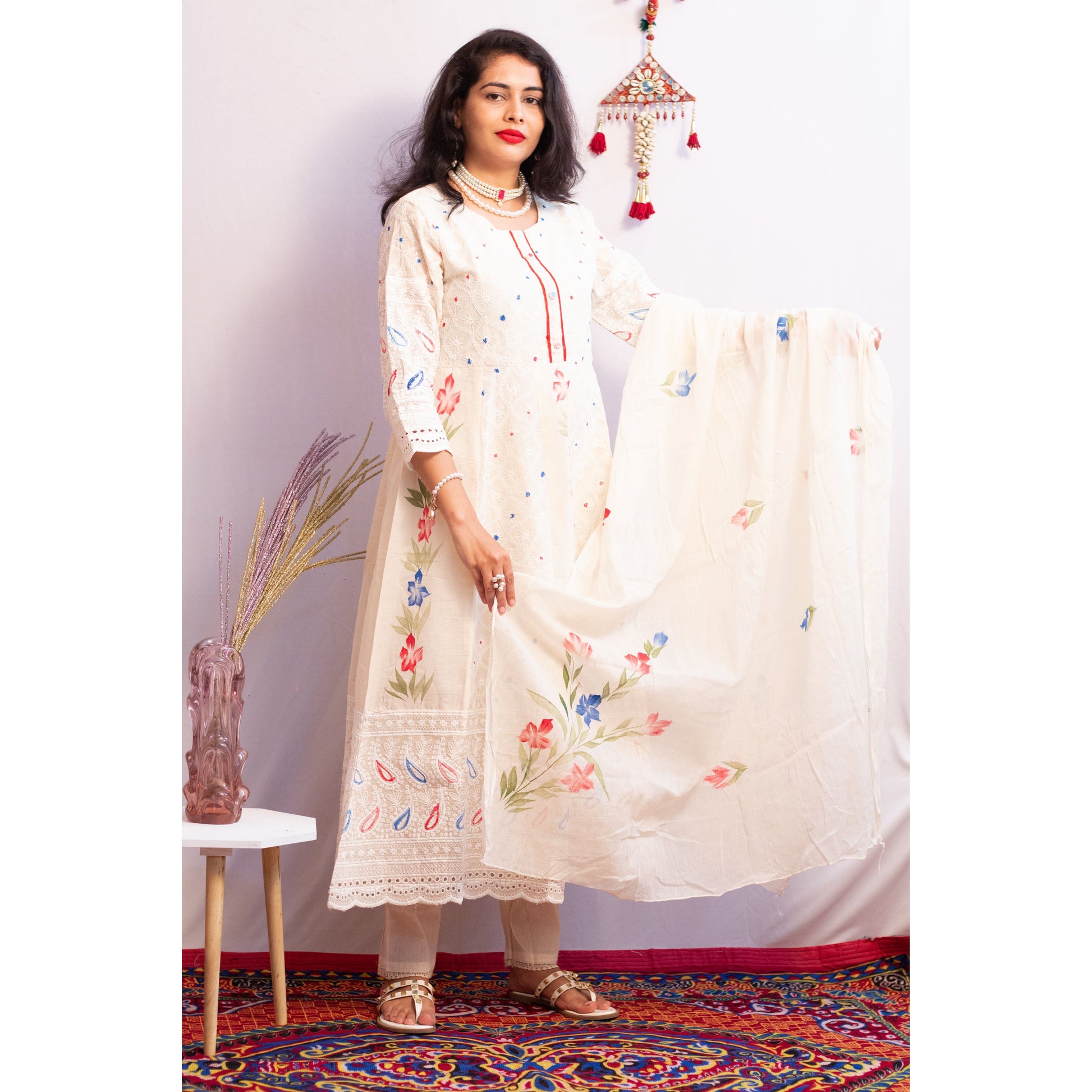 - This Off White Chikankari fabric Block Printed Kurti Suit Set has a round neckline and three-quarter sleeves in Schiffli embroidery. The attractive Chikankari embroidery steals the show. It is paired up with White cotton bottom with lace detailing and Mulmul Printed dupatta which compliments the attire.