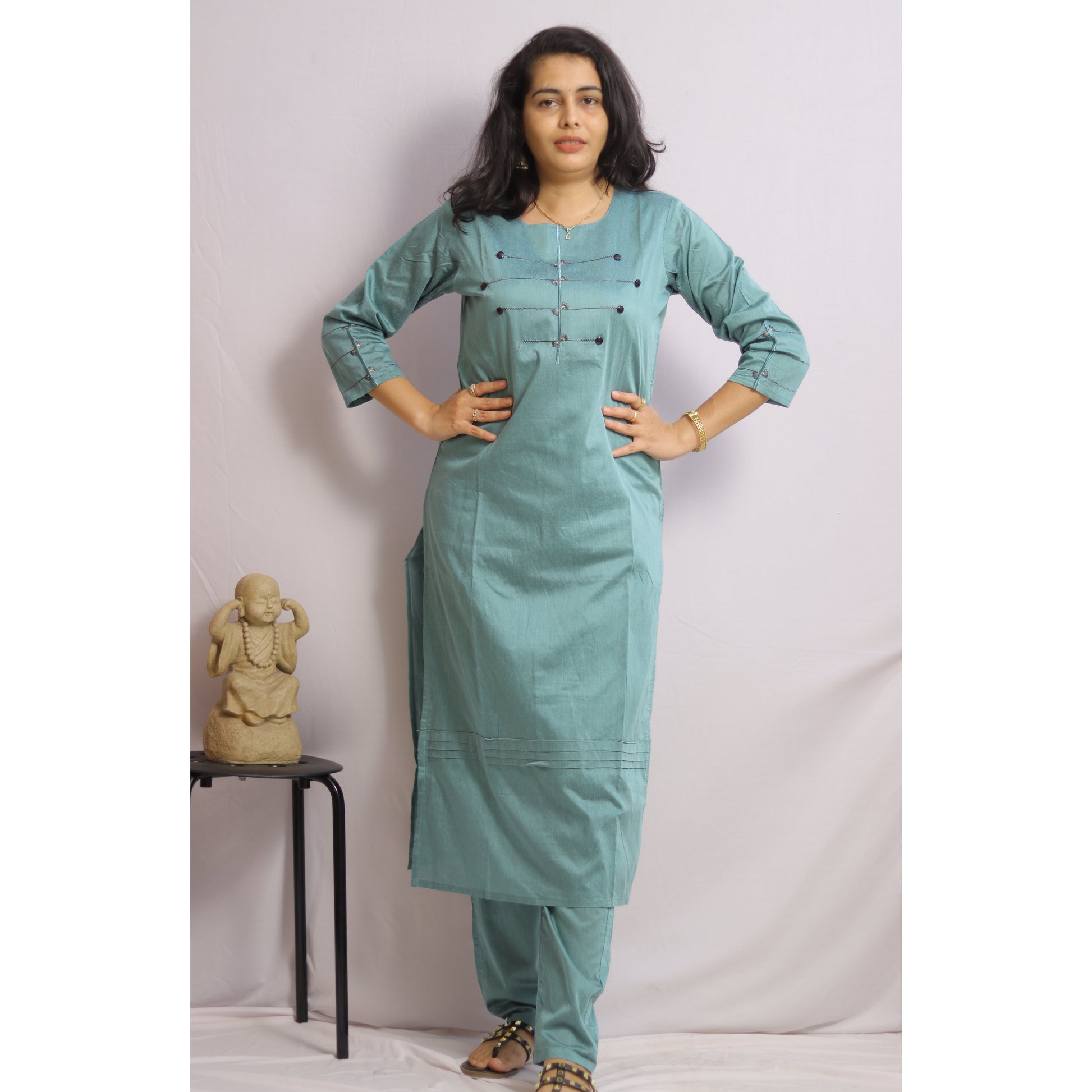- This Teal embroidered kurti pant set features a round neckline with embroidery design at yoke, regular length kurti with matching pants in Roman Silk Fabric and three-forth sleeves with side slits.