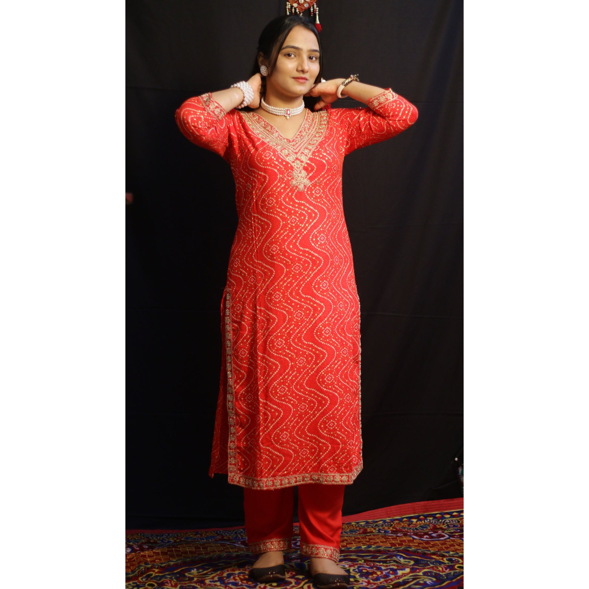 This red German rayon suit set features an elegant Bandhani and zigzag print, enhanced with intricate zari and cut dana embroidery on the neckline, sleeves, and side slits. Complemented by solid red pants adorned with delicate embroidery along the edges, it offers a refined and cohesive look. The set is completed with a chiffon dupatta finished with embroidered edges on all four sides, making it a sophisticated choice for festive and formal occasions.