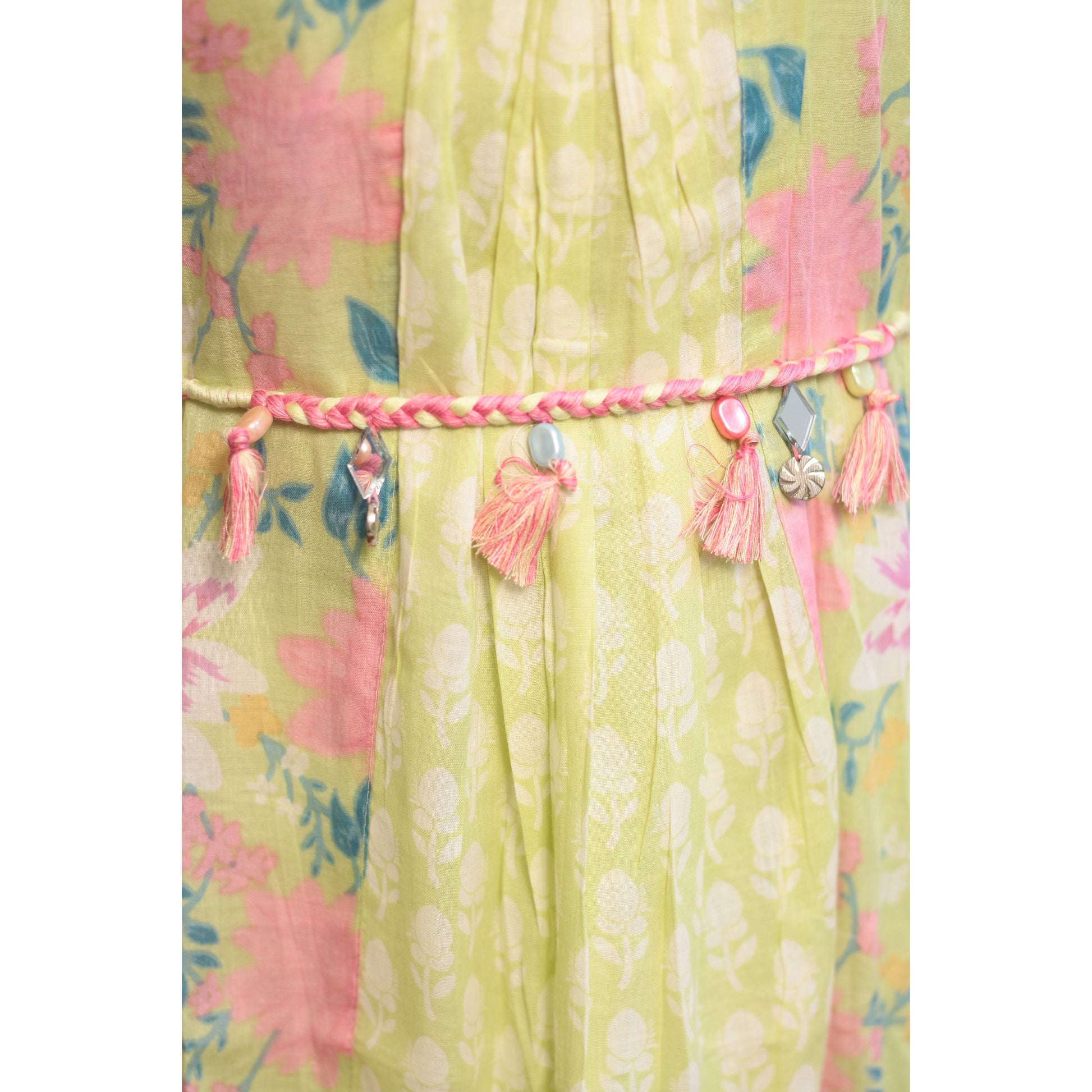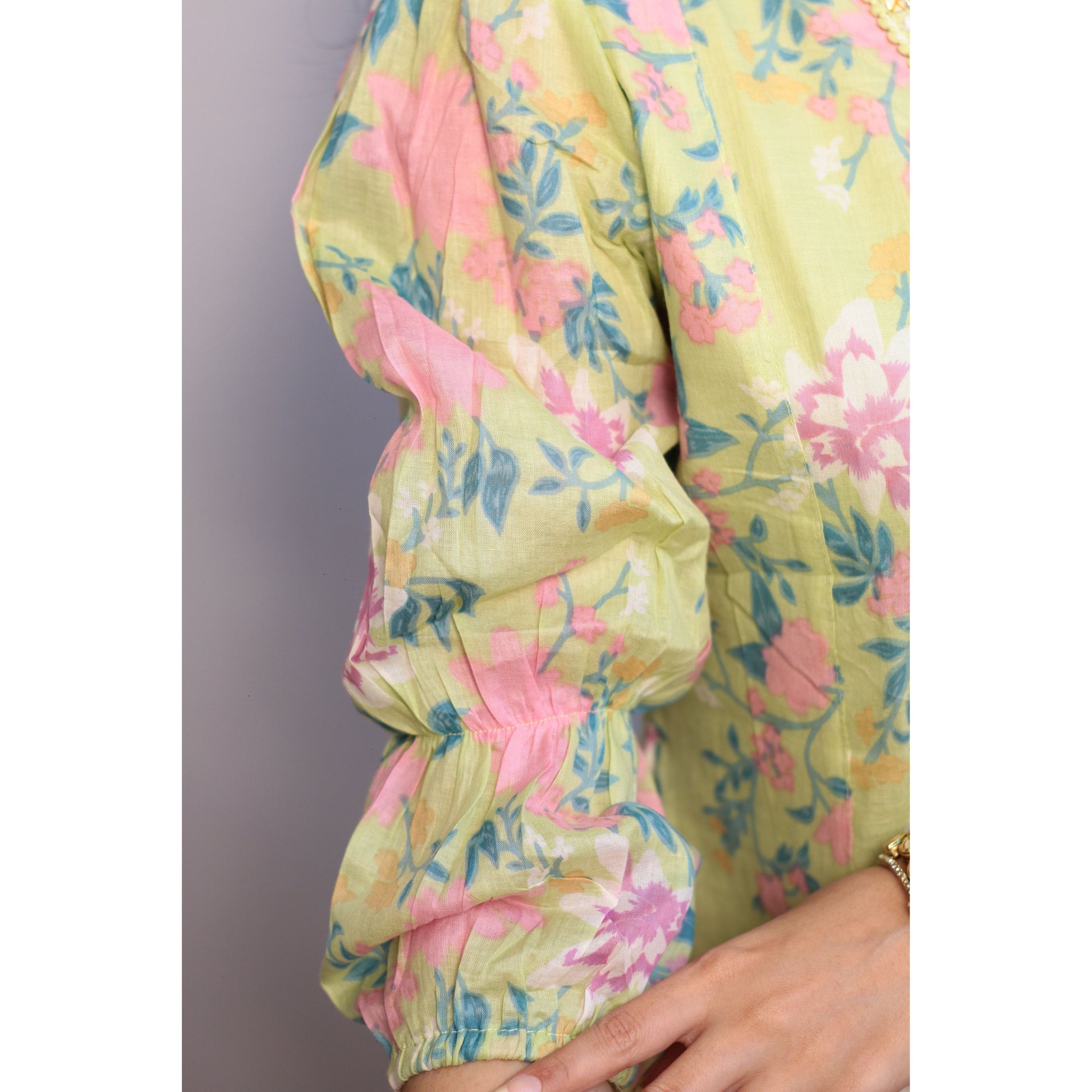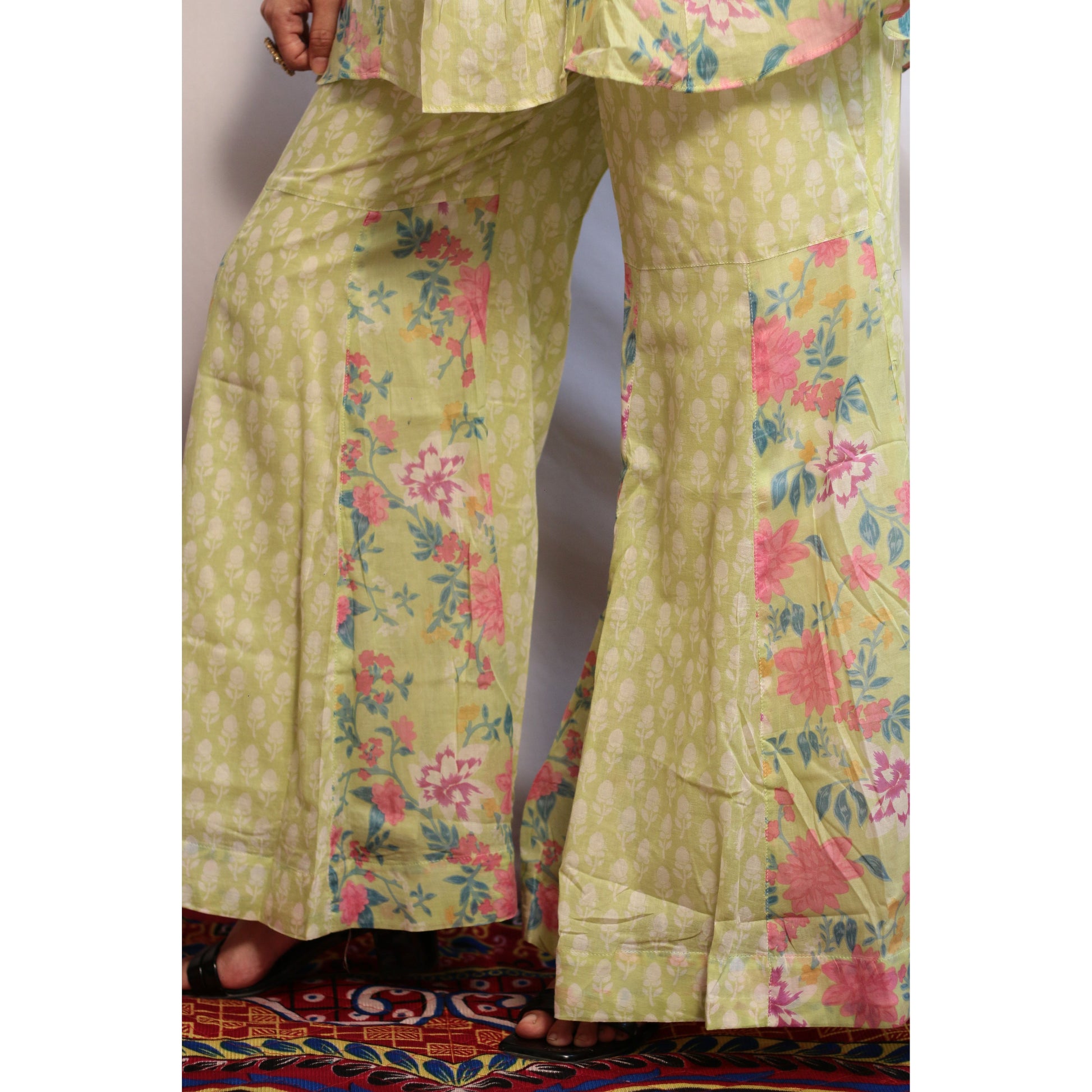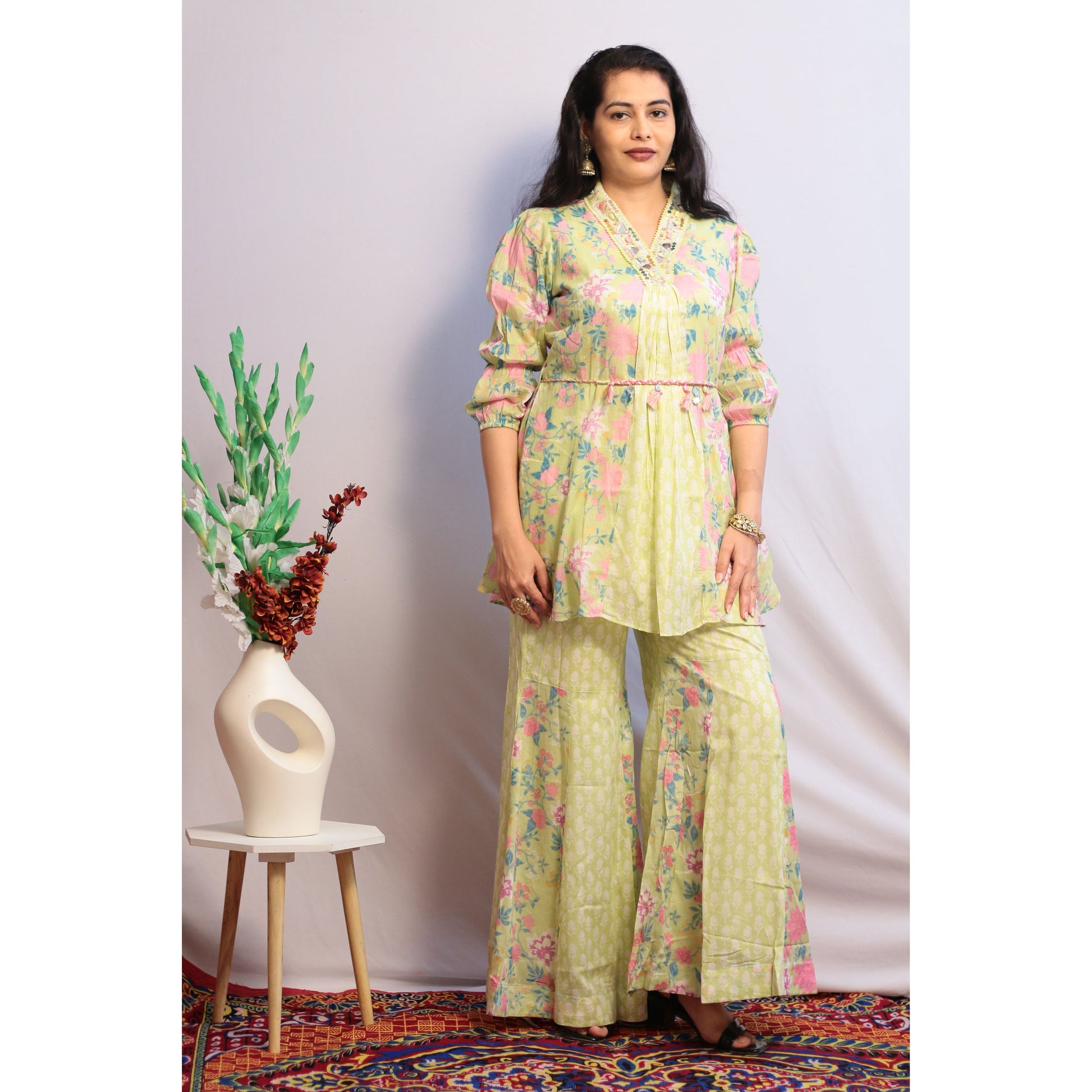 - Experience elegance and comfort with our Zubeida Gharara Set. Made from pure Mul Cotton, this set comes in a beautiful pastel green color. The knee length kurti features balloon sleeves, a collared V neckline, and a stylish beaded belt for added flair. The printed design adds a charming touch to the sharara pants, making this set perfect for any occasion.