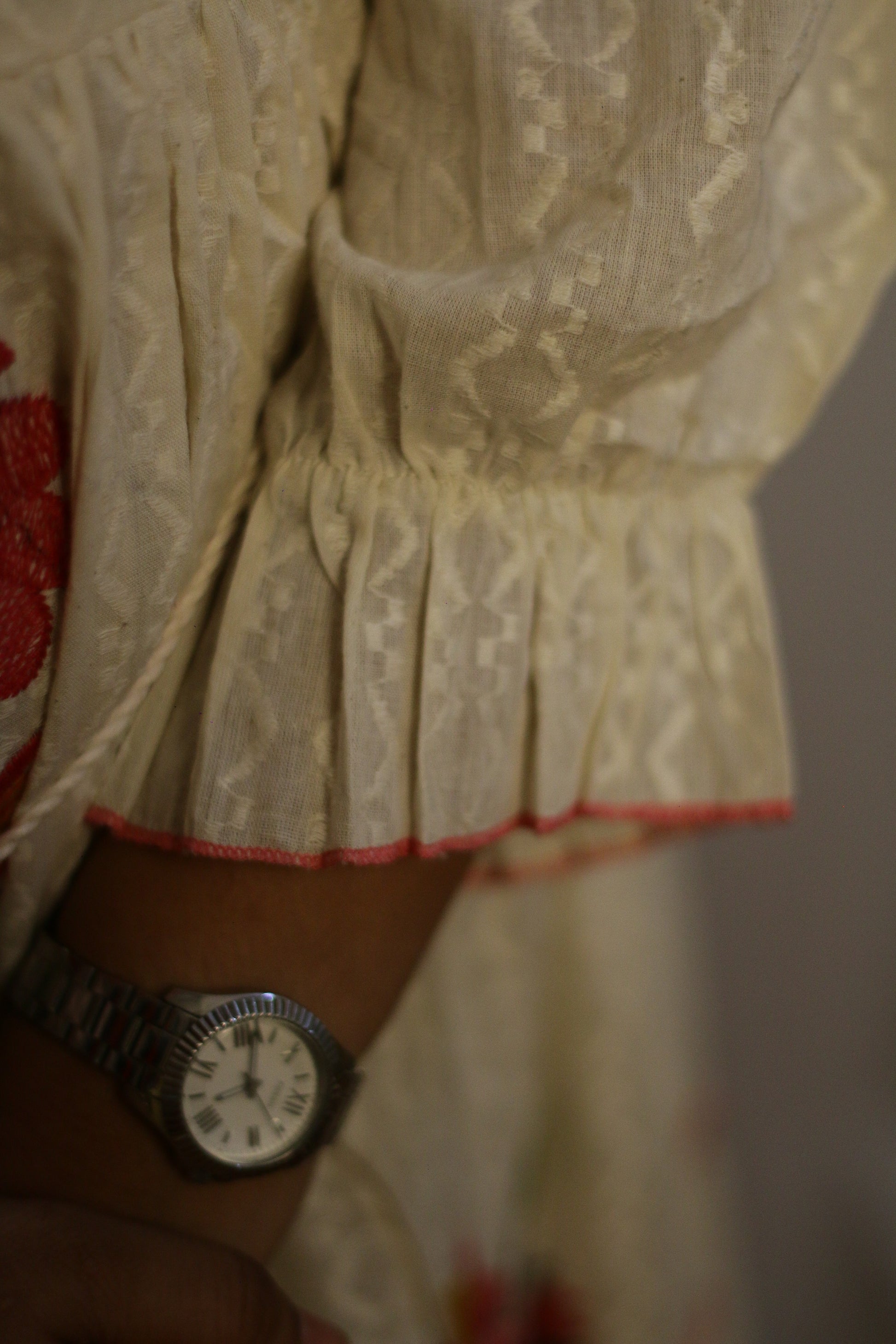 Embrace soft elegance with the Zuri Ivory Bloom Dress, crafted in breathable cotton with a subtle jacquard weave that adds depth and texture. The dress features stunning floral thread embroidery in vibrant hues of pink and mustard yellow, bringing life to its soothing ivory base. Its gentle gathers at the waist create a flattering flare, while the full sleeves with delicate frill cuffs add a touch of timeless romance. Perfect for festive brunches, family gatherings, or serene day outings, this dress is where comfort meets craftsmanship in its truest form